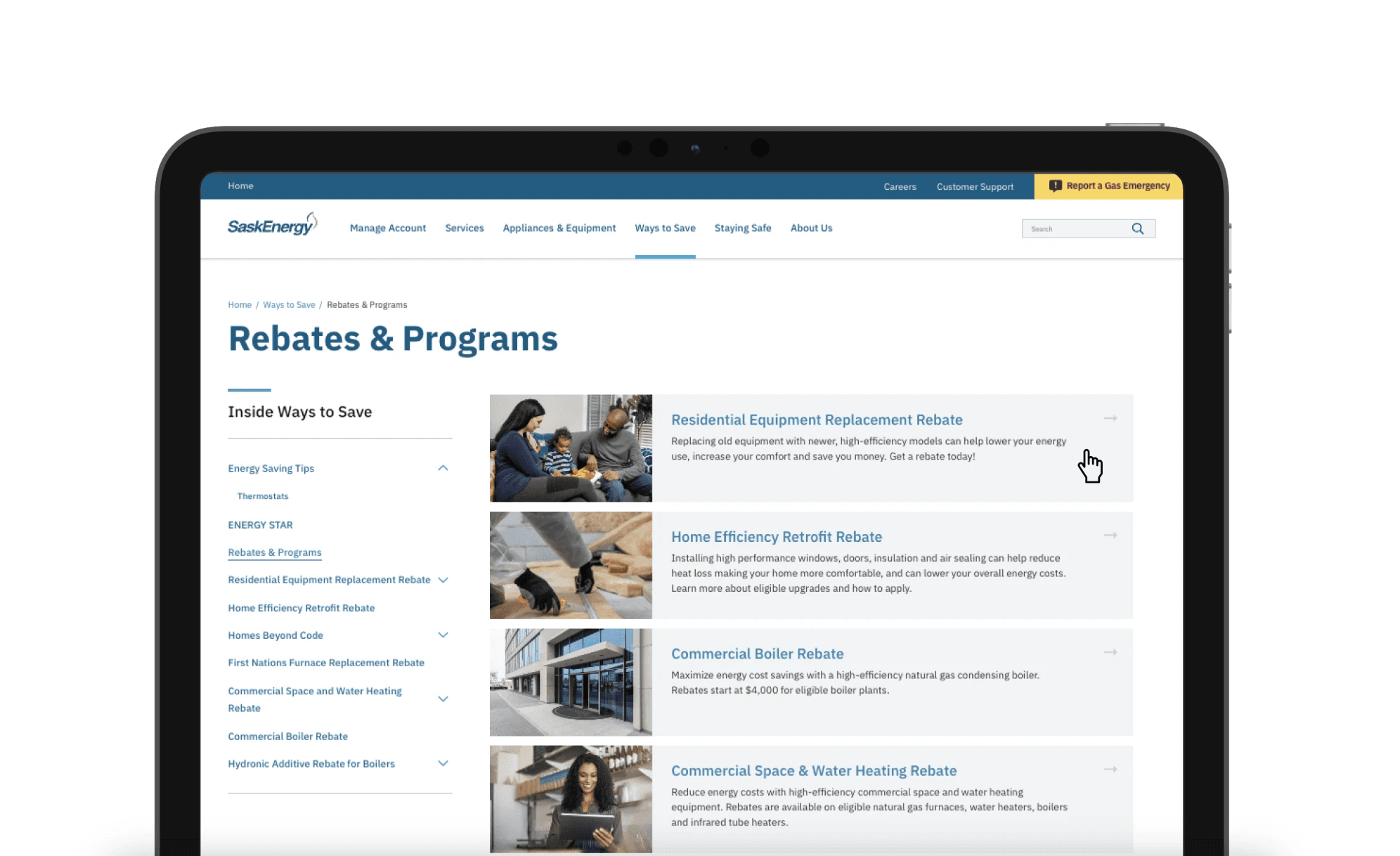 As the lead designer for the Residential Equipment Replacement Rebate program, my focus was on fostering innovation and user-centric solutions. This initiative incentivizes homeowners to choose energy-efficient equipment, aiming to reduce energy costs and greenhouse gas emissions while enhancing comfort. While seemingly straightforward, I wanted to add to my case study! Its relevance to my community and its government nature warranted.